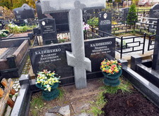 Изначально на месте захоронения находился лишь широкий горизонтальный памятник из чёрного гранита, разделённый на две половины светлым православным крестом. Клиент пожелал выгравировать на пустом пространстве памятник новую надпись, так как на могиле недавно произошло дозахоронение.
